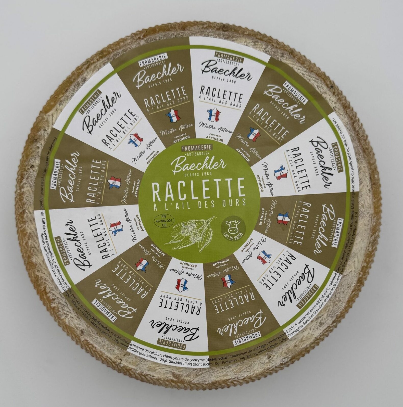 La raclette à l’ail des ours de la Fromagerie Baechler met à l’honneur la fraîcheur végétale de cette plante sauvage, associée à la douceur d’un fromage fondant soigneusement élaboré. Produite dans le Lot-et-Garonne à partir de lait pasteurisé de vache, elle reflète tout le savoir-faire de Baechler, qui marie subtilement authenticité et inspiration herbacée.