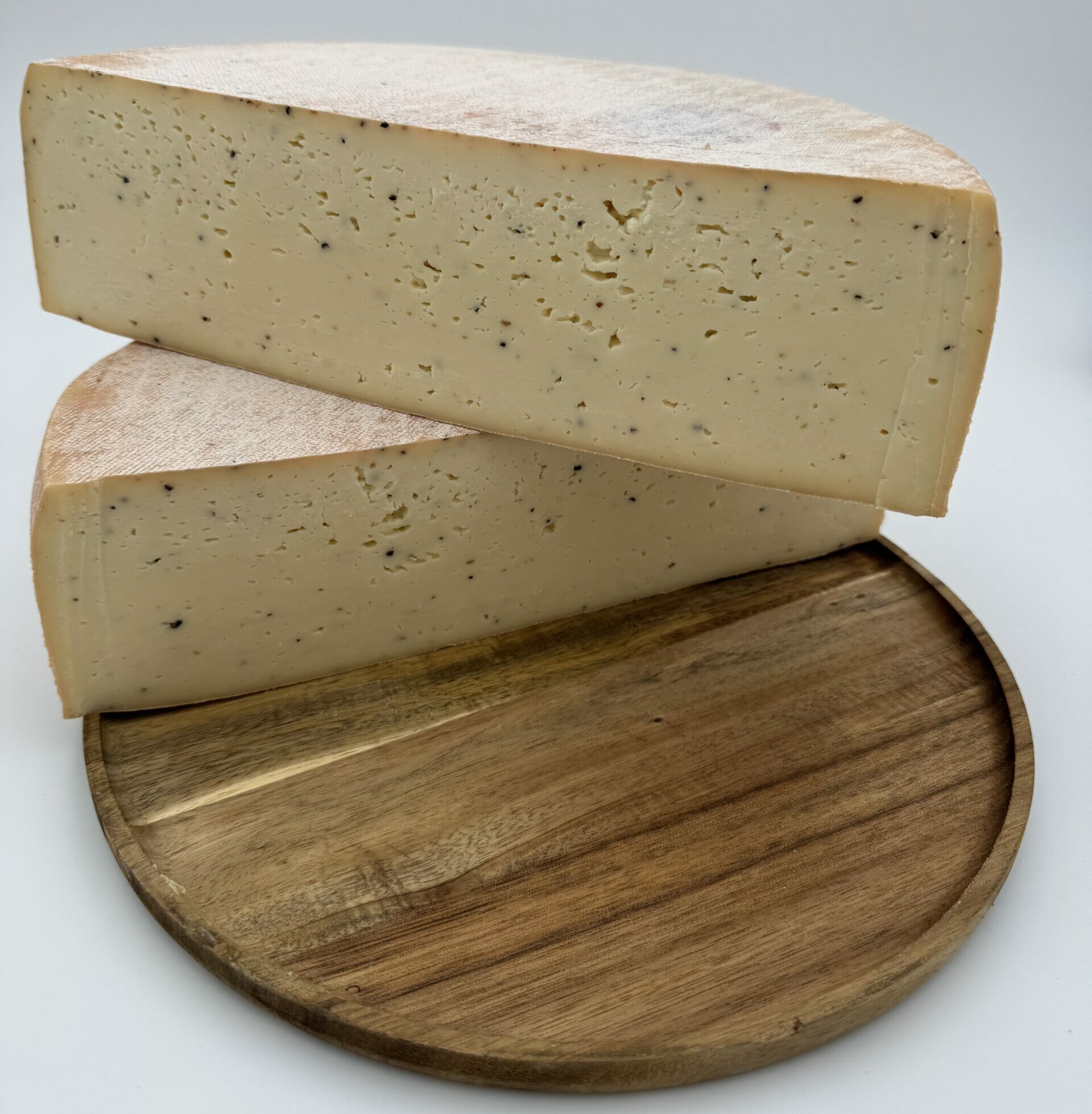 Sa meule dorée, délicatement parsemée de brisures de truffe, présente une croûte lavée légèrement cuivrée aux parfums de cave alpine et d’herbes sèches. À la chauffe, sa pâte fondante et crémeuse libère une texture généreuse qui amplifie les arômes de truffe, leur donnant une profondeur encore plus séduisante.